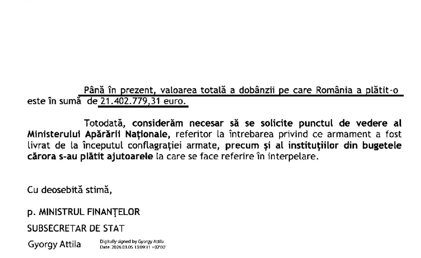 Aceasta reprezintă partea ce revine României din costurile totale ale dobânzilor, conform cotei stabilite la nivelul Uniunii Europene", se arată în documentul prezentat în exclusivitate de Realitatea Plus.