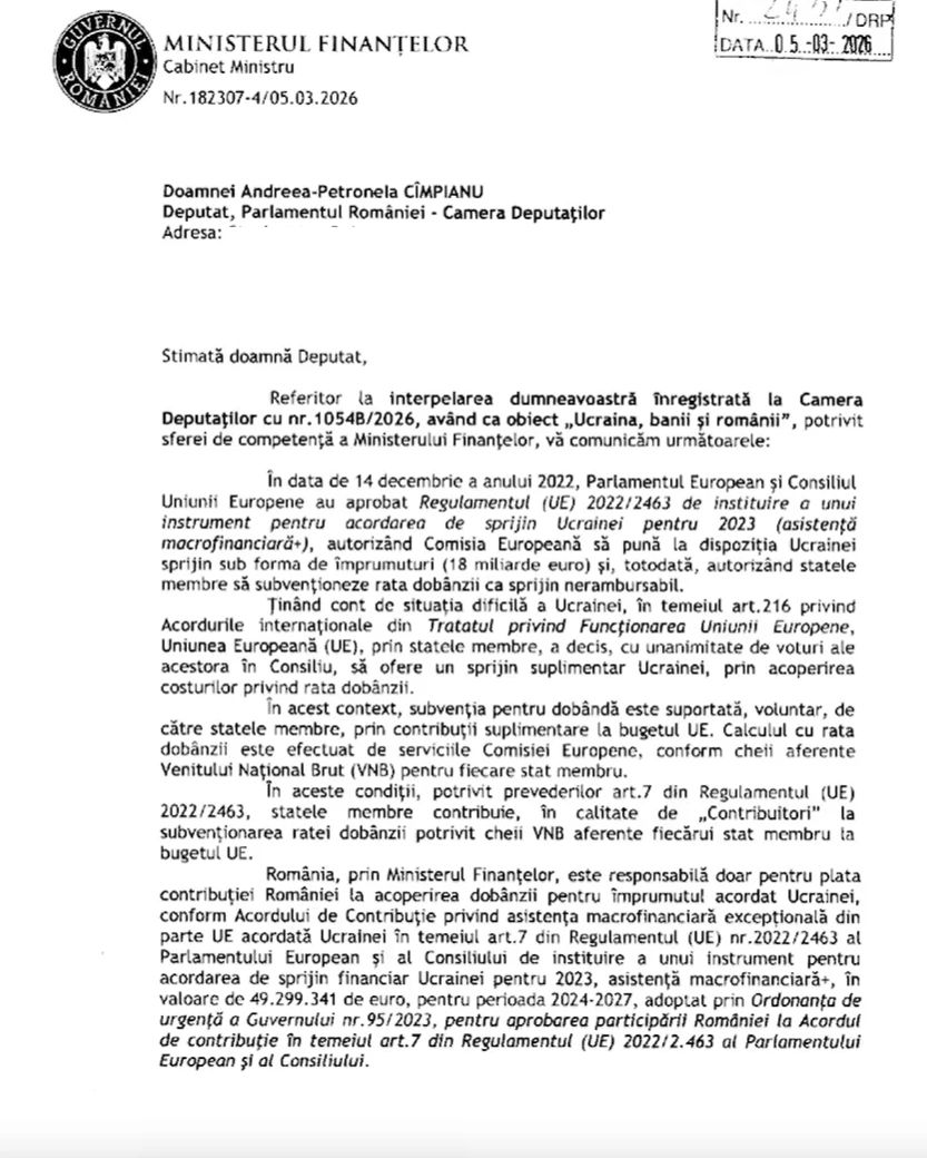 Într-un răspuns oficial al Ministerului Finanțelor la interpelarea unui parlamentar, se precizează că suma pe care România a achitat-o pentru dobânzile la împrumuturile obținute de Ucraina este de 21,4 milioane de euro, dar suma totală pe care o are de achitat este aproximativ dublă. "În anul 2023, Uniunea Europeană a adoptat Regulamentul (UE) 2022/2463 privind instituirea unui instrument de asistență macro‑financiară pentru Ucraina. Prin acest regulament, Comisia Europeană a fost autorizată să acorde Ucrainei un împrumut în valoare de 18 miliarde euro, statele membre contribuind prin subvenționarea ratei dobânzii.