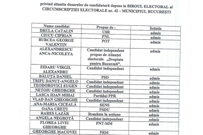 Biroul Electoral al circumscripției București a prezentat, marți seară, situația actualizată a candidaților înscriși în cursa pentru fotoliul de primar general. În urma analizei documentației depuse, un al treilea dosar a fost respins, după ce inițial fusese amânat.