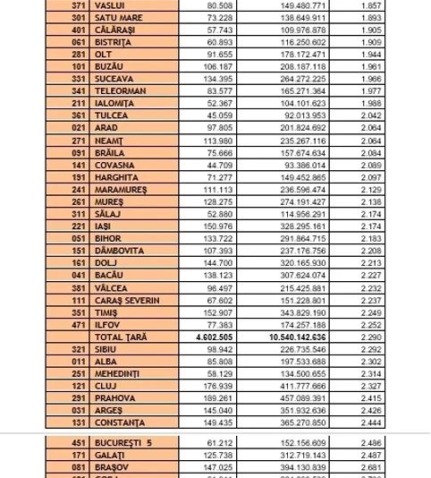 La polul opus, județul fruntaș al celor mai mari pensii este Hunedoara, cu o pensie medie de puțin peste 3.000 lei (3.044 lei). Topul prezentat de CNPP prezintă datele pentru București pe sectoare, iar aiuci putem observa diferențe semnificative. Astfel, în vreme ce în Sectorul 1 se înregistrează cea mai mare pensie medie din țară - 3.407 lei, în Sectorul 5 pensia medie nu atinge nici măcar 2.500 lei.