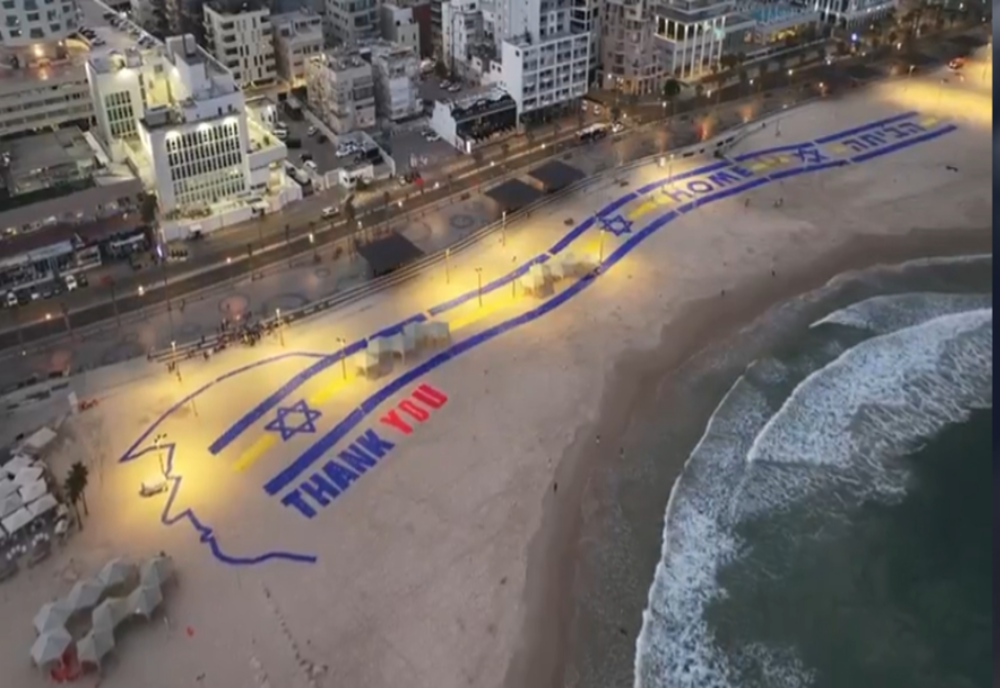 Președintele american Donald Trump este așteptat luni cu un mesaj uriaș de mulțumire ce se poate observa pe plaja din Tel Aviv, potrivit imaginilor difuzate de Channel 12, relatează The Times of Israel.
