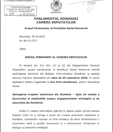 Biroul Permanent al Camerei Deputaților a aprobat astăzi solicitarea PSD de chemare a premierului Ilie Bolojan în Parlament pentru a da explicații cu privire la retragerea trupelor americane, reproșându-i „lipsa de reacție” privind „implicațiile asupra angajamentelor strategice și de securitate ale României”.