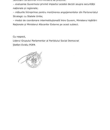 „Având în vedere informaţiile apărute în spaţiul public privind decizia Statelor Unite de a retrage o parte din trupele americane staţionate în România, considerăm necesar ca Prim-ministrul să ofere Parlamentului o prezentare clară a poziţiei Guvernului și a demersurilor întreprinse în dialogul cu partenerii strategici.