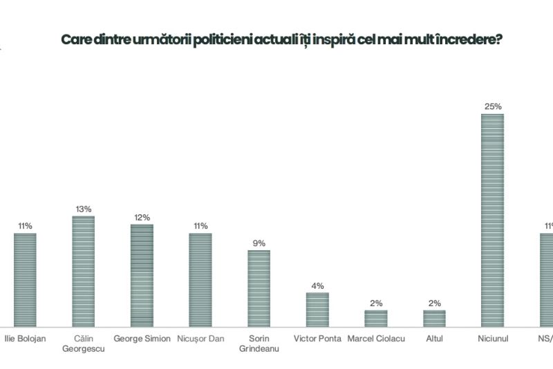 În ceea ce privește încrederea în politicieni, cercetarea arată că românii se lasă pe mâna suveraniștilor, și nu a actualei clase politice. Călin Georgescu se bucură de un procent de 13%, secondat de George Simion, cu 12%.